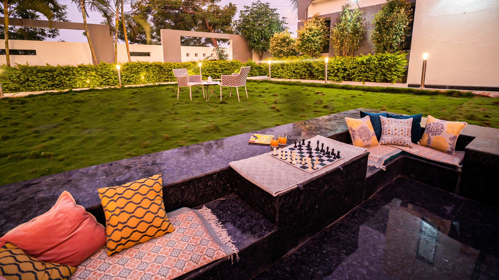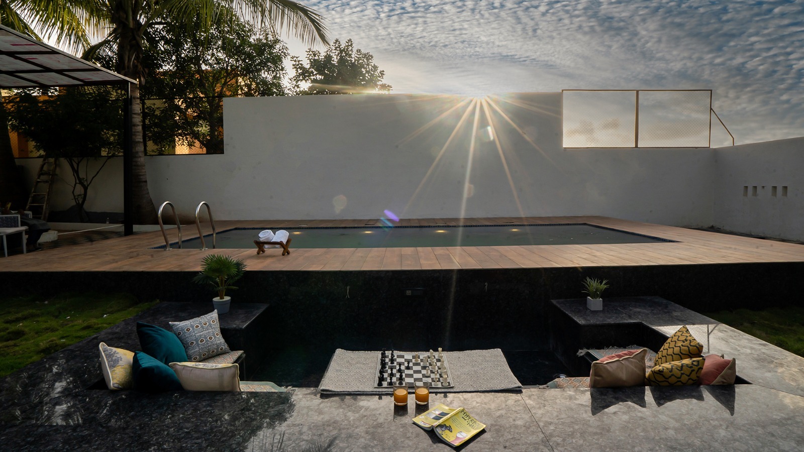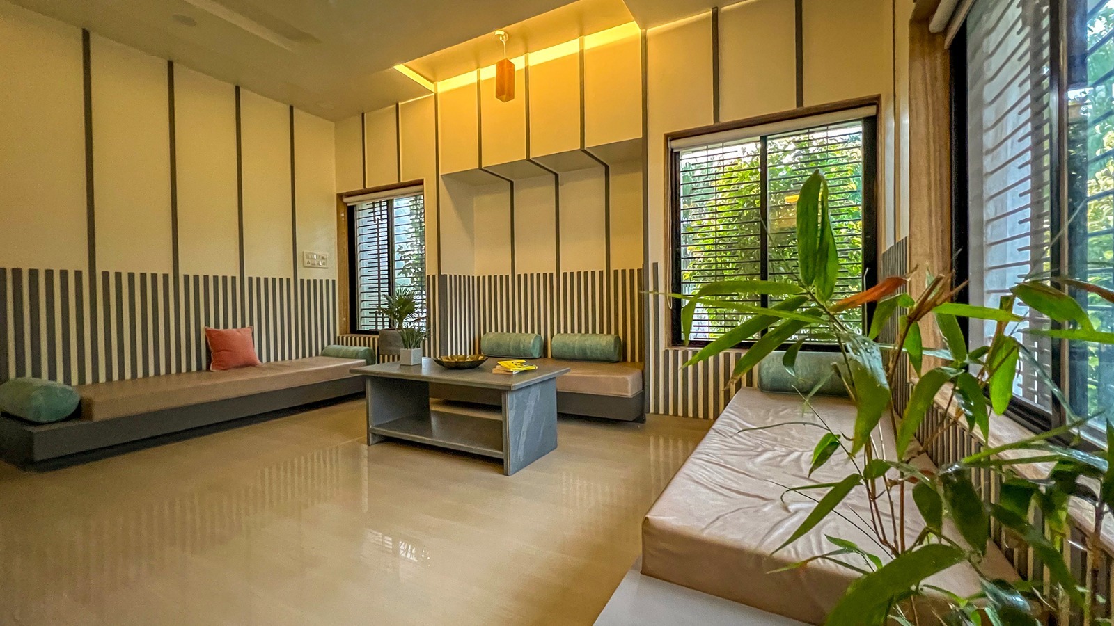 Renovated by Atelier 226, this 3500 sq.ft 3BHK farmhouse in Adgaon transforms rustic simplicity into refined serenity. Thoughtfully planned living spaces, natural textures, and an earthy palette come together to honour its rural charm while elevating comfort and usability. This villa is a quiet dialogue between landscape and lifestyle—where timelessness grows wild.